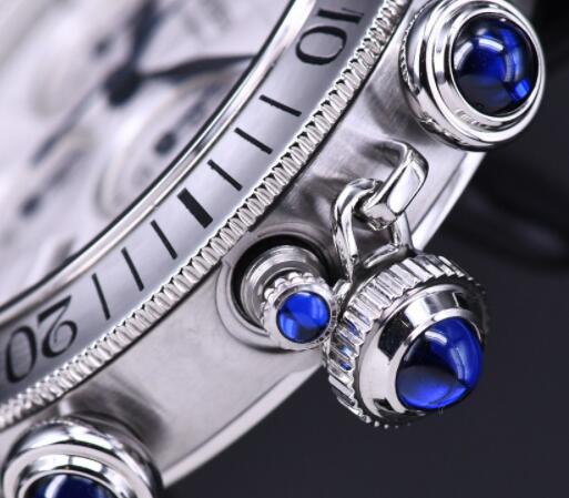 クラウンマーク性短いチェーン採用して設計固定して、1つの凸円形を象眼して青いスピネル合成して、2つボタンはそれぞれ1枚凸円形の宝石を象眼して、忠実に原版パサの時計の設計を再現します。